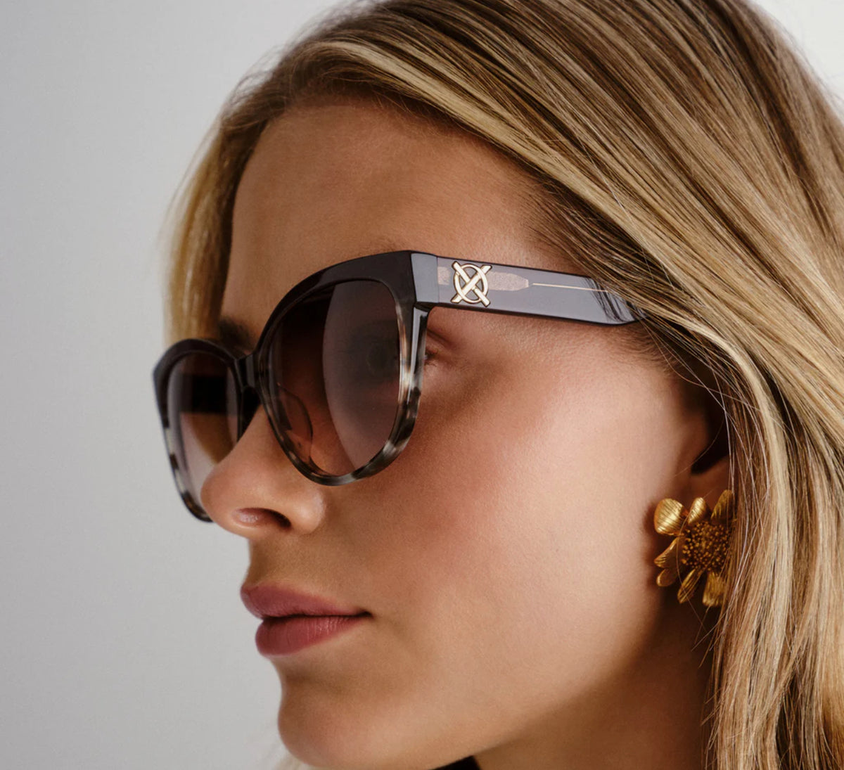 • Finished in a premium chambray tort and charcoal frame with brown gradient lenses.